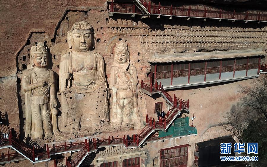 12月26日,游客在麦积山石窟参观游览(无人机拍摄)。新华社记者马宁摄