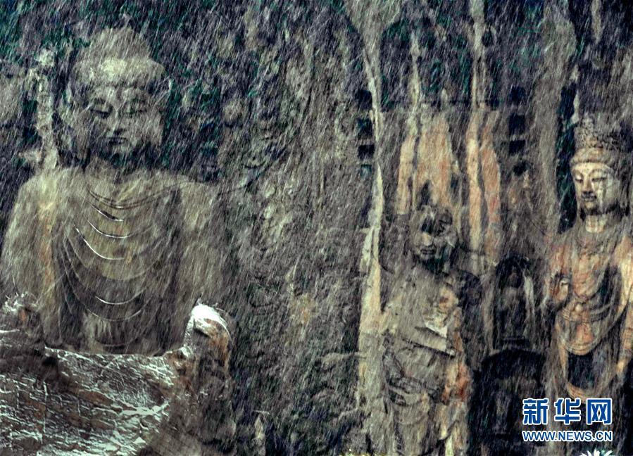 洛阳龙门石窟景区内的卢舍那大佛在雪中若隐若现(1月9日摄)。新华社记者李安摄