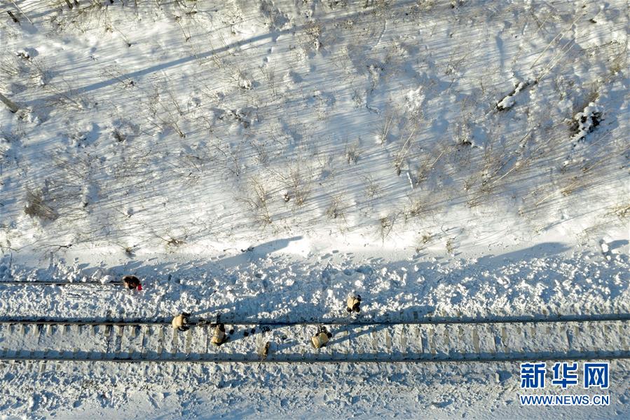 1月8日,西罗奇维修工队工作人员在嫩林线501公里处进行线路维修作业(无人机照片)。新华社记者王毓国摄