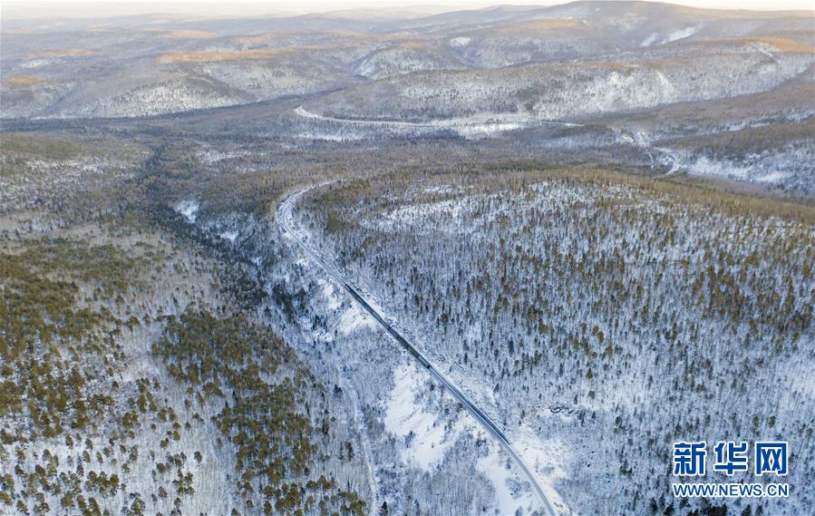 1月6日,一辆列车穿行在西罗奇维修工队管区的林海雪原上(无人机照片)。新华社记者才扬摄