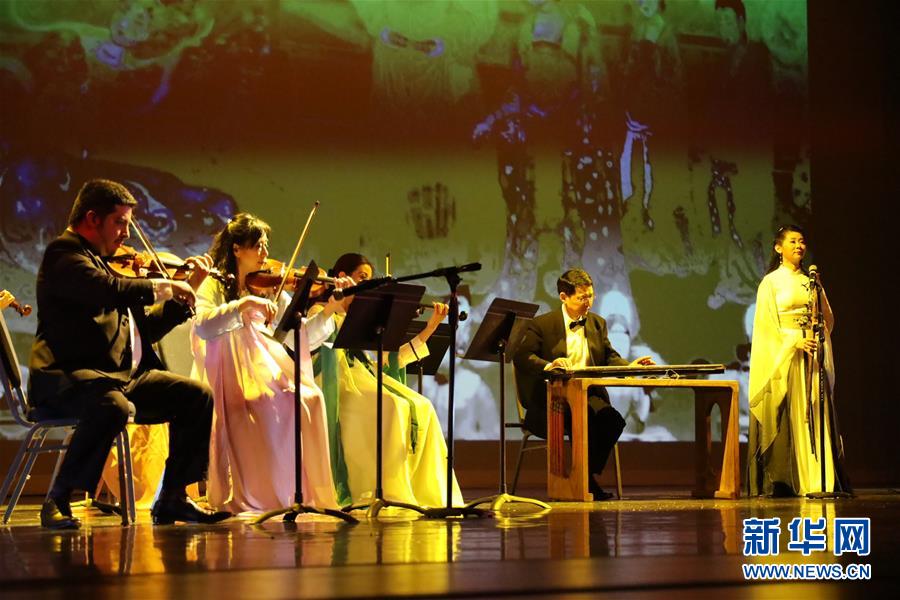 1月11日,在美国休斯敦举办的“拥抱春天”晚会上,艺术家演奏大唐乐舞《清平乐》。新华社记者 刘立伟 摄
