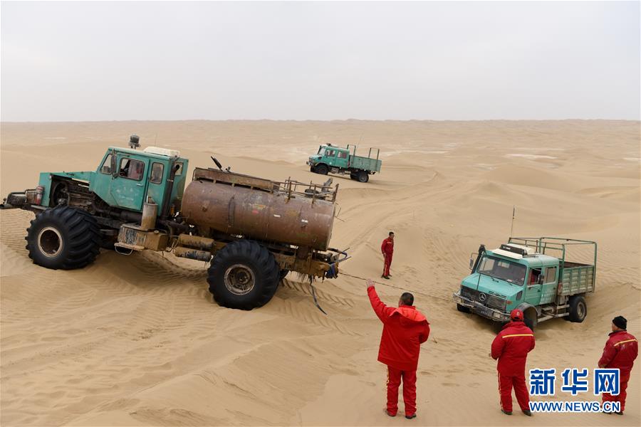一辆测量作业车陷在沙坑中,水罐车进行营救(1月13日摄)。地球物理勘探是油气开发的第一步,相当于给地球做CT。物探工人按照严格的测线部署,在相应位置钻井,然后实施地震,采集地震波数据。科研人员通过数据组成的“CT片”,就能够清晰地“看”到地下的地质结构,判断哪里埋藏有石油或者天然气。2019年10月,东方地球物理勘探有限责任公司塔里木物探处2113队进入新疆塔克拉玛干沙漠腹地,开始中古14-21、塔中2两个区块的三维地震勘探。近2000名物探工人将在1000平方公里的范围内一直工作到2020年4月,这也意味着他们将在塔克拉玛干沙漠腹地连续度过第14个除夕夜。蕴藏着丰富石油天然气资源的新疆塔克拉玛干沙漠有“死亡之海”之称,气候干燥,年降水量在50毫米以下,冬季地表最低温度超过零下30摄氏度,是世界油气勘探难度最大的地区之一。为避开风季,物探工人每年9、10月份进入沙漠,一直工作到来年4月,夜以继日与黄沙、严寒为伴,用辛勤的汗水,为祖国找油找气。新华社记者丁磊摄