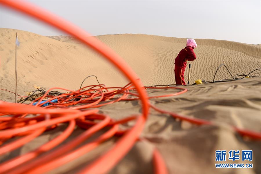 1月14日,放线工张进秀在放完一组检波器后直起腰休息。地球物理勘探是油气开发的第一步,相当于给地球做CT。物探工人按照严格的测线部署,在相应位置钻井,然后实施地震,采集地震波数据。科研人员通过数据组成的“CT片”,就能够清晰地“看”到地下的地质结构,判断哪里埋藏有石油或者天然气。2019年10月,东方地球物理勘探有限责任公司塔里木物探处2113队进入新疆塔克拉玛干沙漠腹地,开始中古14-21、塔中2两个区块的三维地震勘探。近2000名物探工人将在1000平方公里的范围内一直工作到2020年4月,这也意味着他们将在塔克拉玛干沙漠腹地连续度过第14个除夕夜。蕴藏着丰富石油天然气资源的新疆塔克拉玛干沙漠有“死亡之海”之称,气候干燥,年降水量在50毫米以下,冬季地表最低温度超过零下30摄氏度,是世界油气勘探难度最大的地区之一。为避开风季,物探工人每年9、10月份进入沙漠,一直工作到来年4月,夜以继日与黄沙、严寒为伴,用辛勤的汗水,为祖国找油找气。新华社记者丁磊摄