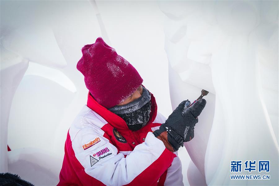 1月13日,参赛选手在哈尔滨太阳岛雪博会园区创作雪雕。