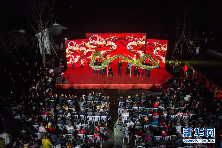 1月14日,杭州市余杭区中泰街道中桥村的文化公园内在进行“我们的村晚”舞龙表演,吸引了大批当地百姓观看(无人机照片)。临近春节,浙江省杭州市余杭区中泰街道各村社的文化礼堂纷纷上演“我们的村晚”。老百姓自编、自导、自演为主的“土味”联欢会因接地气、亲情浓而深受当地百姓的喜爱,成为当地乡村百姓的新年迎春“文化大餐”。近年来,中泰街道以文化振兴助推乡村振兴。目前,中泰街道下属各村陆续建成文化礼堂7个、社区文化家园2个,努力培育和挖掘出一批乡土文化人才及原创作品,2019年全年开展各类乡村社区惠民文体活动累计180余场次。新华社记者徐昱摄