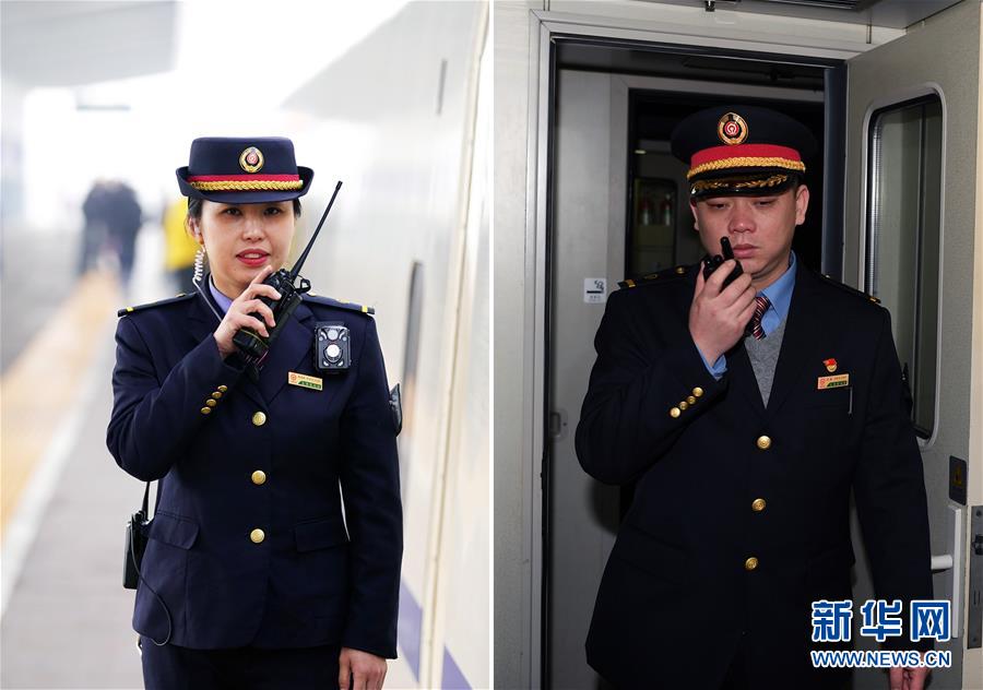 拼版照片左图:在临汾西站,列车长陈海燕通过对讲机了解各个车厢的上车情况(新华社记者詹彦1月11日摄);右图:在太原开往青岛北的K884次列车上,列车长赵耀通过对讲机了解各个车厢的情况(新华社记者杨晨光1月11日摄)。