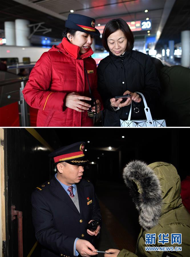拼版照片上图:在西安北站,列车长陈海燕(左)帮助旅客在手机上购买火车票(新华社记者詹彦1月11日摄);下图:在阳泉北站,列车长赵耀(左)为旅客检票(新华社记者杨晨光1月11日摄)。新华社发