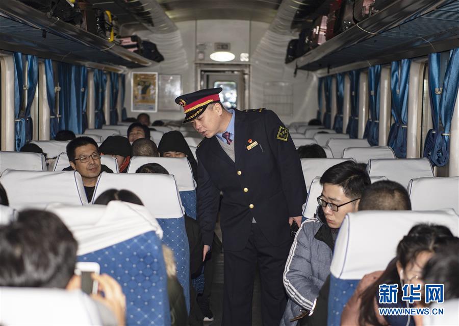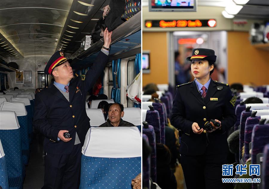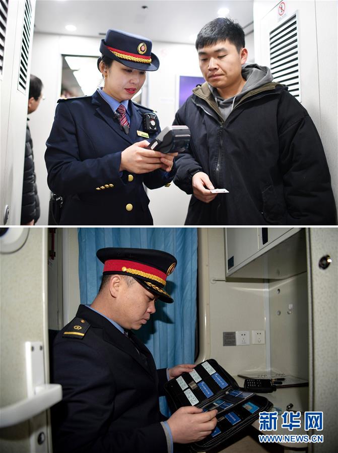 拼版照片上图:在太原南开往西安北的D2507次列车上,列车长陈海燕(左)帮助乘客办理补票业务(新华社记者詹彦1月11日摄);下图:在阳泉北站,列车长赵耀在查看卧铺车票(新华社记者杨晨光1月11日摄)。新华社发