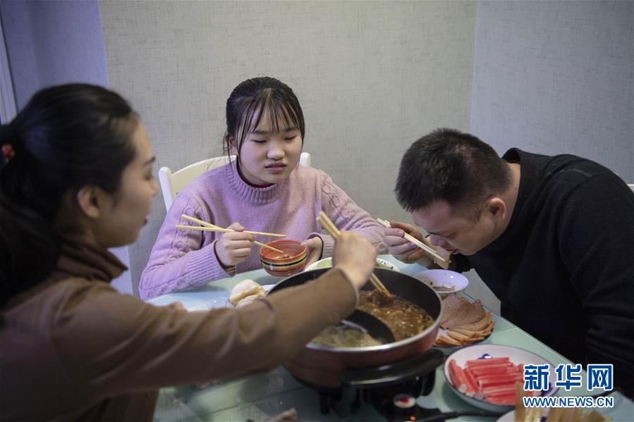 1月14日,赵耀(右)和妻子陈海燕(左)、女儿赵纯艺在家里吃火锅。新华社记者 杨晨光 摄