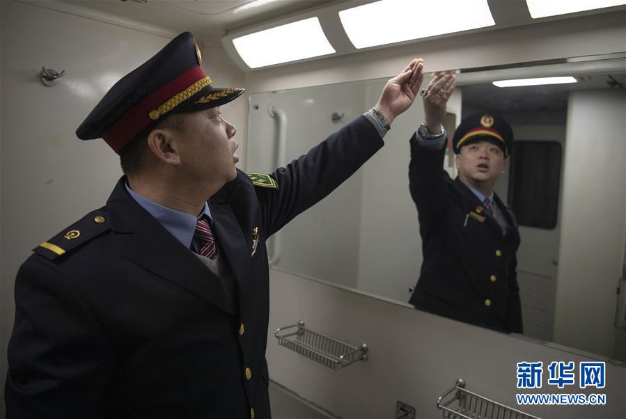 1月11日,在太原开往青岛北的K884次列车上,列车长赵耀在检查车厢卫生情况。新华社记者 杨晨光 摄