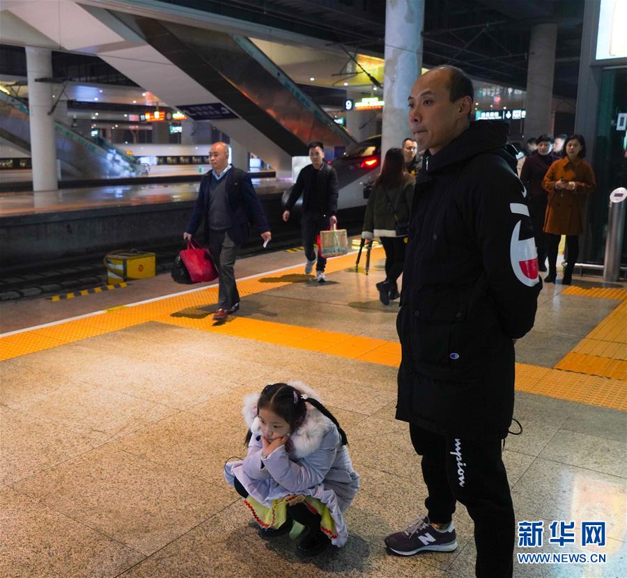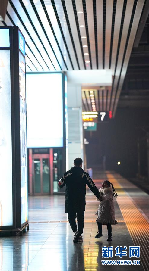 1月3日晚,朱梓芮(左一)在父亲朱晨的陪同下前往南昌西站站台准备与母亲团聚。新华社记者 胡晨欢 摄