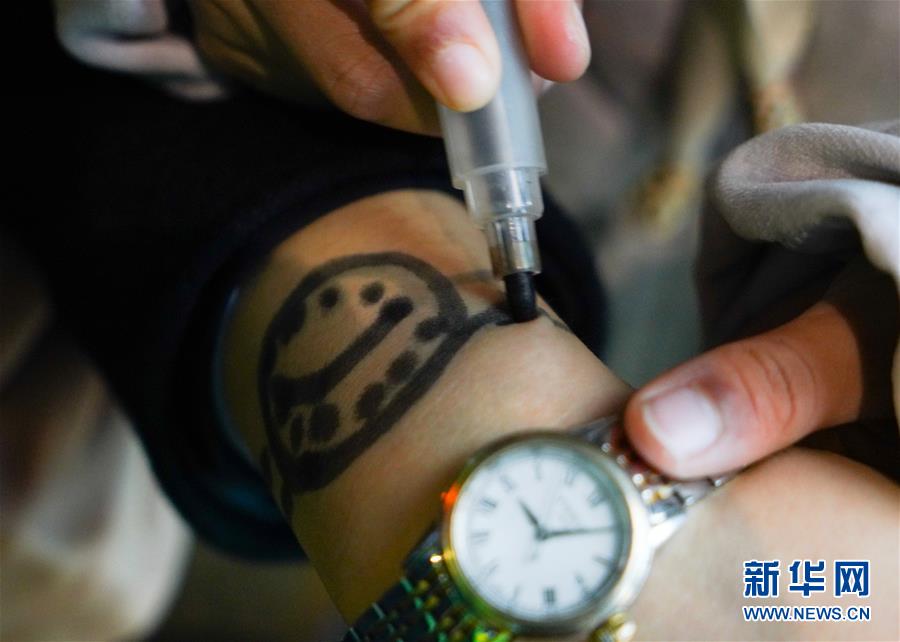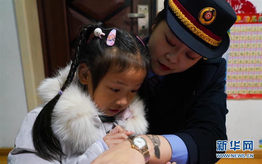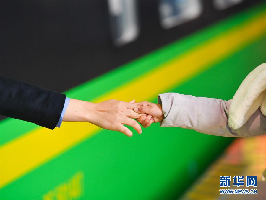 1月3日,朱梓芮在站台上将母亲手腕上稍有模糊的“手表”描绘清晰。新华社记者 胡晨欢 摄