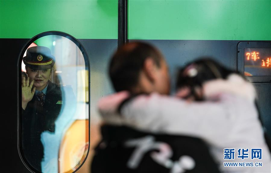 1月3日,列车即将离开南昌西站,车内的卞菁(左)向丈夫和女儿告别。新华社记者 胡晨欢 摄