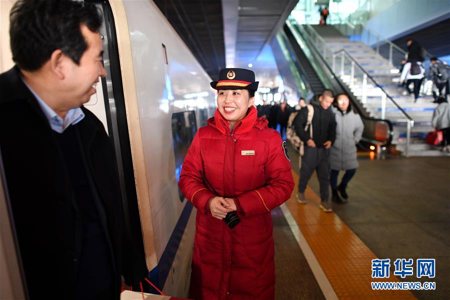 1月11日,在西安北站,列车长陈海燕在站台上目送旅客下车。新华社记者 詹彦 摄