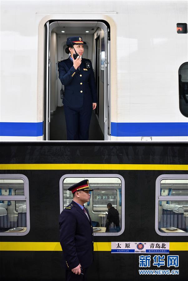 拼版照片上图:在运城北站,列车长陈海燕确认旅客上车后通过对讲机通知司机关闭车门(新华社记者詹彦1月11日摄);下图:在太原站,列车长赵耀在列车出发前检查巡视(新华社记者杨晨光1月11日摄)。新华社发