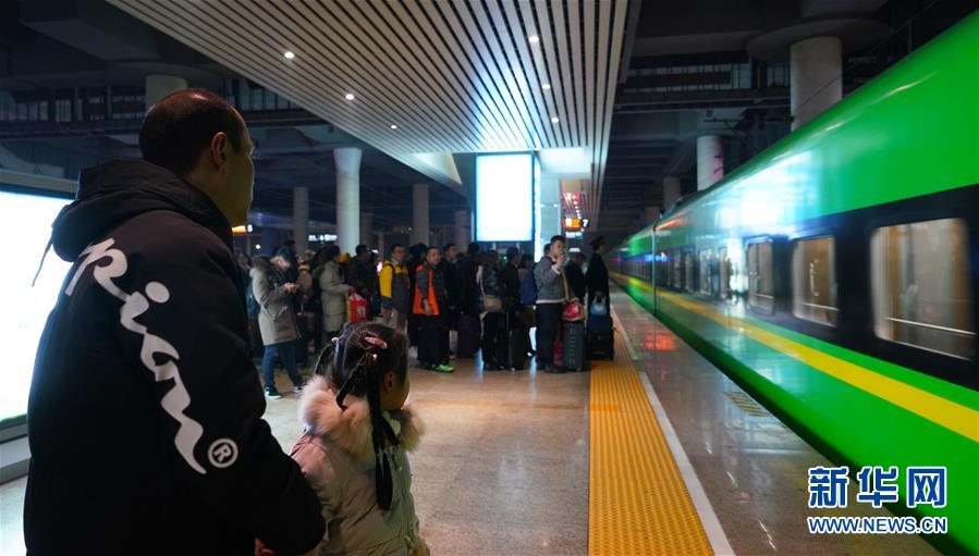1月3日,卞菁值乘的动车到站,朱梓芮(前右)和父亲寻找卞菁的身影。新华社记者 胡晨欢 摄