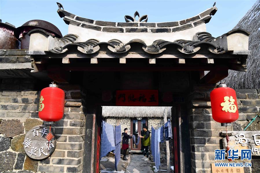在荣成市烟墩角村,于海洋和母亲赵锦兰在打理海草民宿(1月12日摄)。新华社记者 郭绪雷 摄