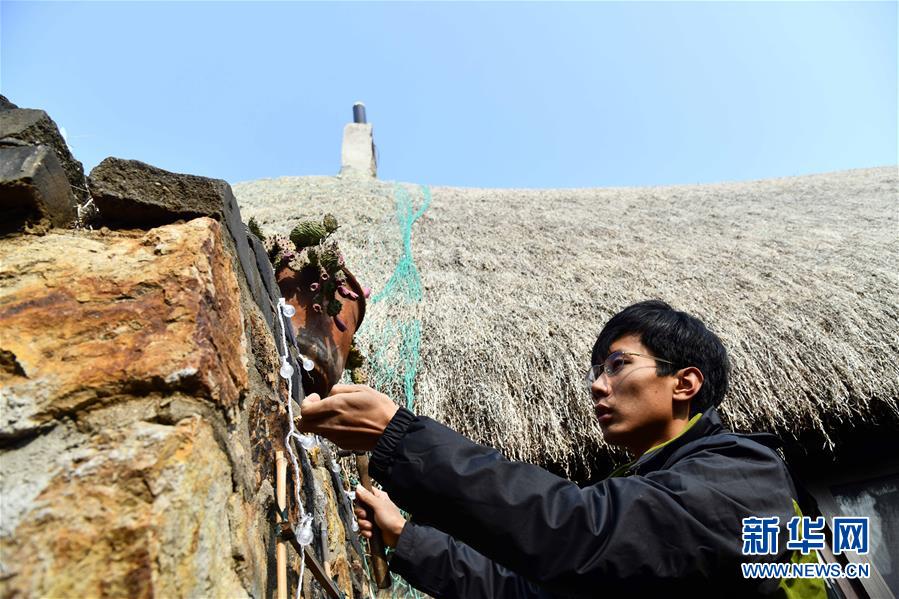 在荣成市烟墩角村,于海洋为海草民宿挂彩灯(1月12日摄)。新华社记者 隋先凯 摄