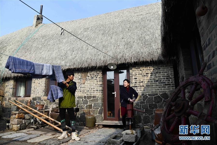 在荣成市烟墩角村,于海洋和母亲赵锦兰在打理海草民宿(1月12日摄)。新华社记者 王凯 摄