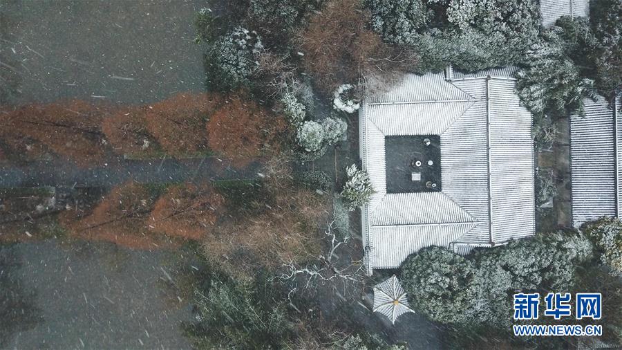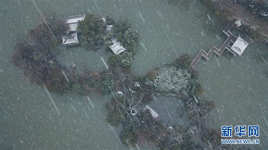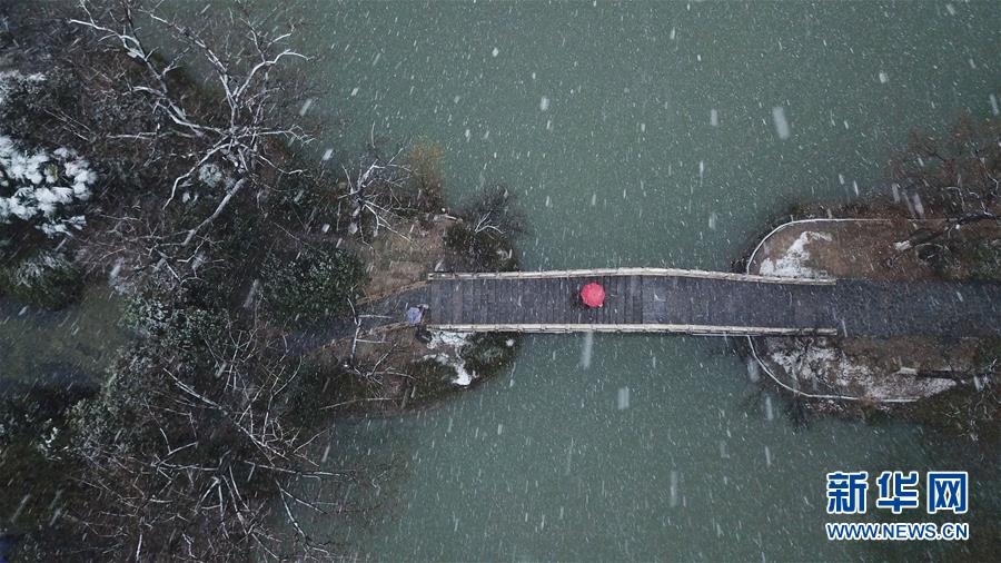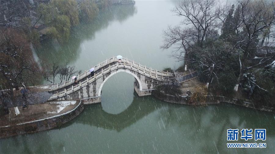 1月15日,几名游客在雪中的合肥市包公园参观(无人机照片)。 当日,安徽省合肥市迎来降雪天气。雪中的合肥市包公园景色别致。 新华社记者 张端 摄