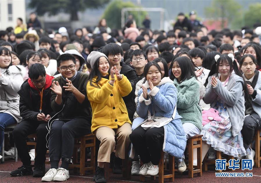 1月15日,师生们在观看慰问演出。 当日,“我们的中国梦”——文化进万家中央歌剧院文艺小分队来到重庆市石柱土家族自治县第一职业学校进行慰问演出,为学校的三千多名师生带来了一场精彩的音乐大餐。 新华社记者 王全超 摄