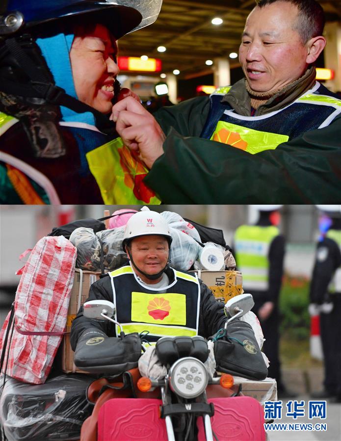 拼版照片:上图是来自江西吉安的陈海平(右)在中国石油泉州博览大道站给爱人郭九香整理摩托车头盔(1月15日摄)。夫妻俩在福建泉州打工十多年,连续九年骑着摩托车返乡,他们表示过完年后还将再来泉州工作。