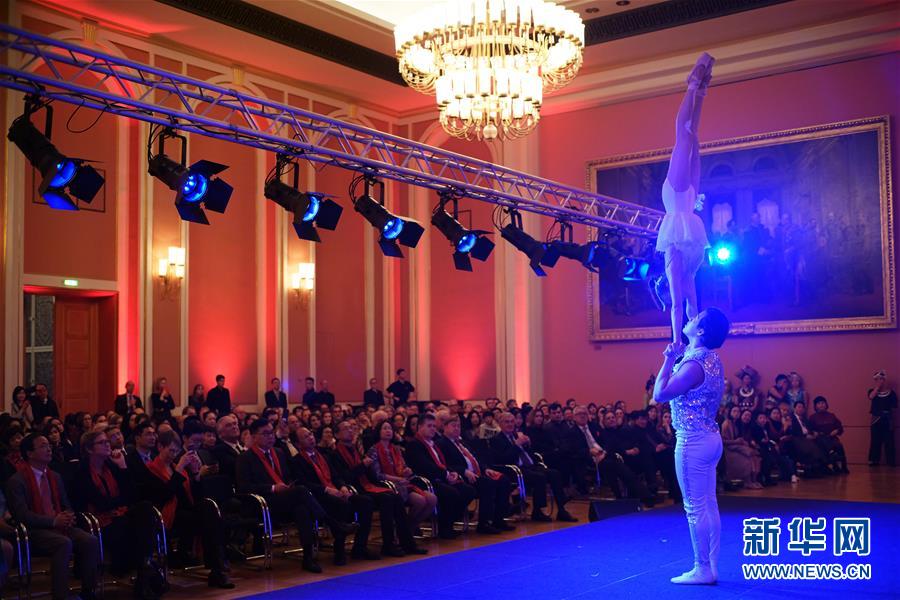 1月15日,在德国柏林,贵州省歌舞剧院艺术团的演员在晚会上表演杂技。 15日晚,2020年“欢乐春节”新春文艺晚会在德国柏林的红色市政厅上演,中德两国各界代表观看演出,共庆中国农历新年。 新华社记者 王勍 摄
