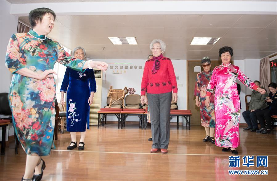 1月17日,王育华(中)向杭州市社会福利中心模特队队员学习走台步。新华社记者 翁忻旸 摄