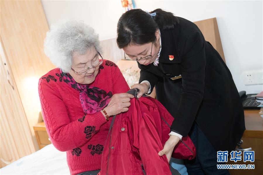 1月17日,张丹侠(右)帮助手臂曾经骨折的王育华穿外衣。新华社记者 翁忻旸 摄