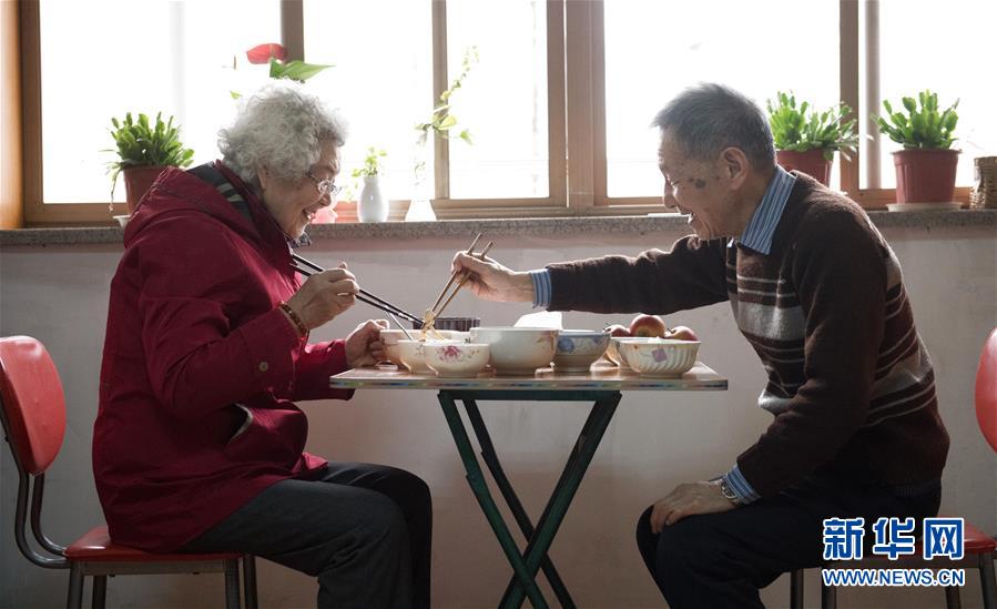 1月17日,王育华(左)和丈夫李伟光在杭州市社会福利中心宿舍吃午饭。新华社记者 翁忻旸 摄