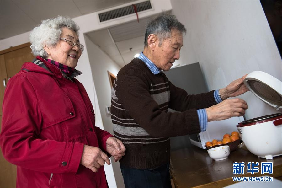 1月17日,王育华(左)回到宿舍,丈夫李伟光为她加热从食堂打回的饭菜。新华社记者 翁忻旸 摄