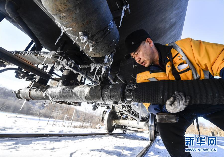 林海间的“送水小火车” 调车员对“送水小火车”进行出行前的检查作业(1月17日摄)。新华社记者 许畅 摄