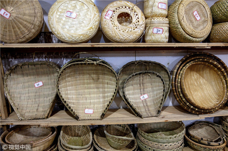 2019年1月26日,重庆中山古镇,880桌“千米长宴”5万人共品年味。古镇居民们编制的竹编制品。