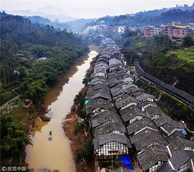 2019年1月26日,重庆中山古镇,880桌“千米长宴”5万人共品年味。夜幕下的中山古镇,灯光璀璨,流水潺潺。