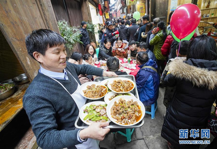 1月18日,一名中山古镇的居民给体验“千米长宴”的游客上菜。新华社记者刘潺摄