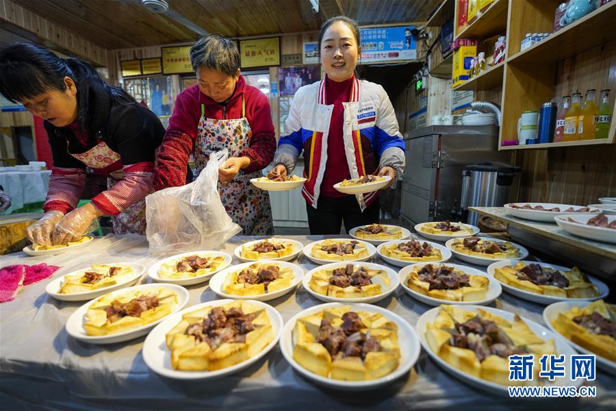 1月18日,中山古镇的一户商家在“千米长宴”开席前准备菜品。新华社记者刘潺摄