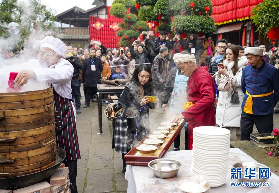 1月18日,中山古镇的“千米长宴”开席后,民间艺人在等待厨师给长条形的上菜盆备菜。新华社记者刘潺摄