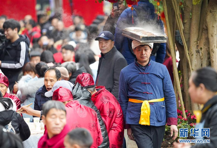 1月18日,在中山古镇的“千米长宴”上,民间艺人用古镇传统“打盆”绝艺给游客们上菜。新华社记者刘潺摄