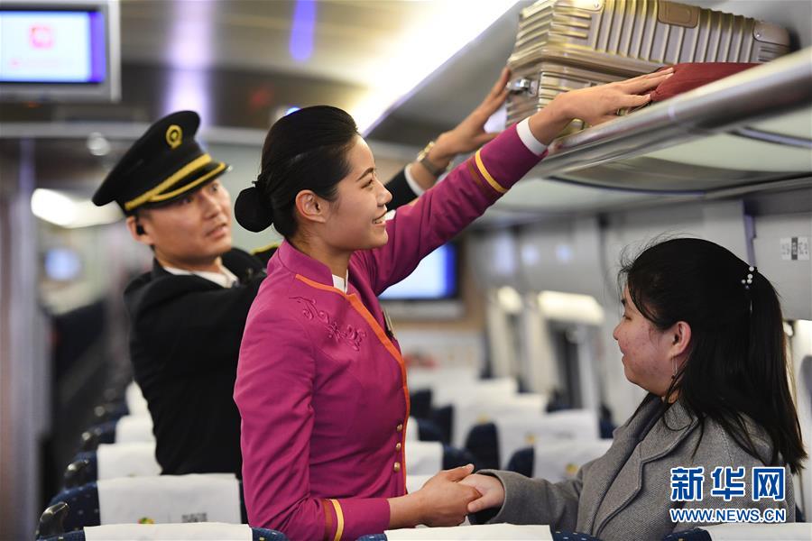 吉如(中)将盲人姑娘吴潇护送上车后,为她安放行李(1月15日摄)。新华社记者陶明摄