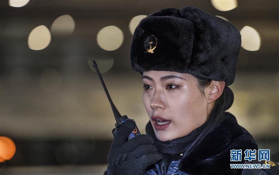 吉如在西安北站站台上,与检票口客运人员联控(1月14日摄)。今年春运列车开行密度大,站台岗位人员紧张,吉如时常被调到站台进行站台服务工作。新华社记者陶明摄
