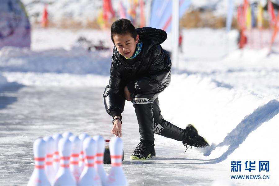 1月18日,游客在新疆天池景区玩冰上保龄球。
