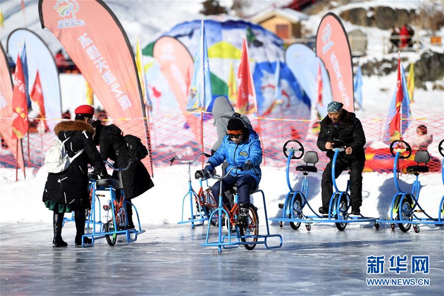 1月18日,游客在新疆天池景区玩冰上自行车。新华社记者 沙达提 摄