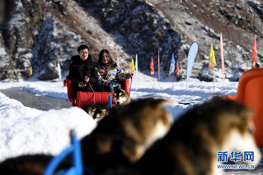 1月18日,游客在新疆天池景区玩电动狗拉雪橇。新华社记者 沙达提 摄