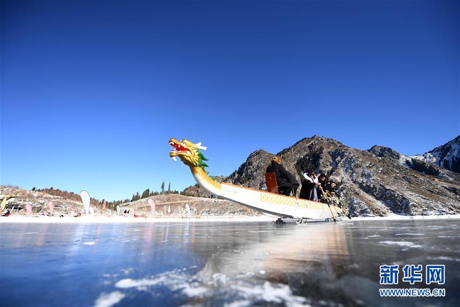 1月18日,游客在新疆天池景区玩冰上龙舟。新华社记者 沙达提 摄