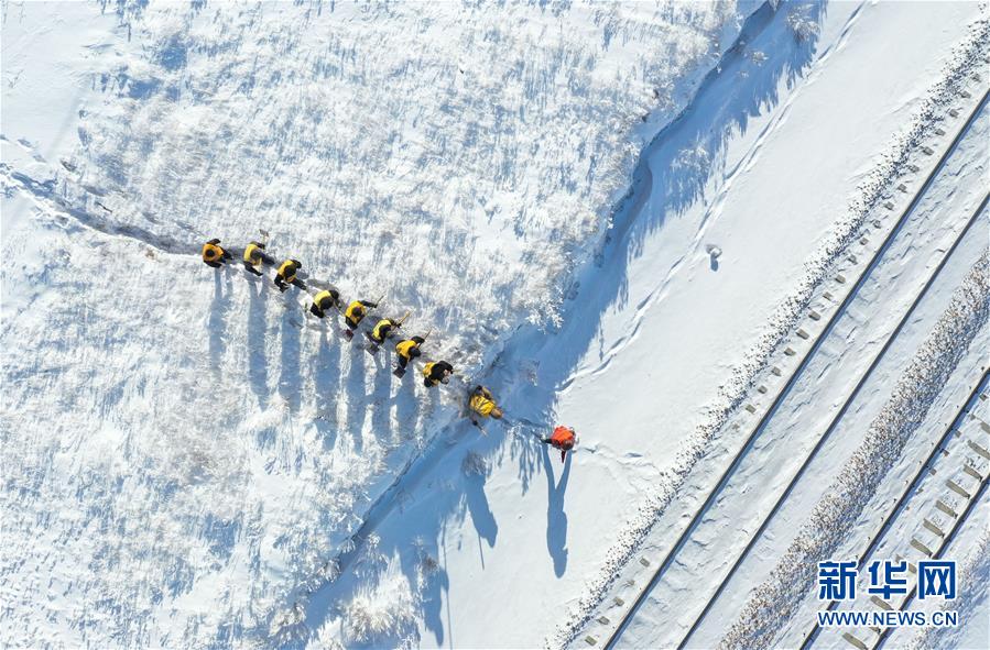1月13日,白音库伦综合维修车间的职工来到作业点准备工作(无人机照片)。新华社记者刘磊摄