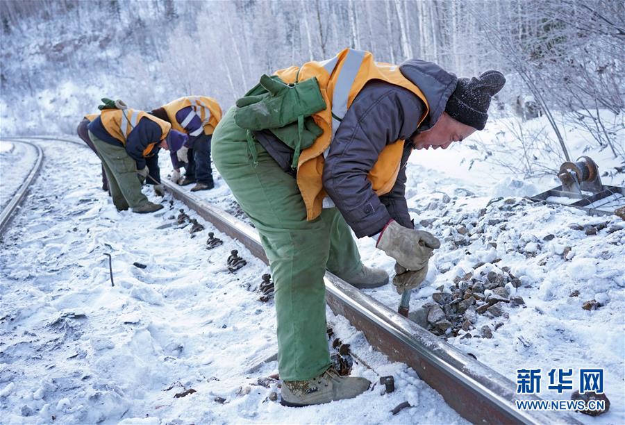 1月7日,西罗奇维修工队工作人员在加格达奇工务段西罗奇岭二号隧道附近进行维修作业。新华社记者才扬摄
