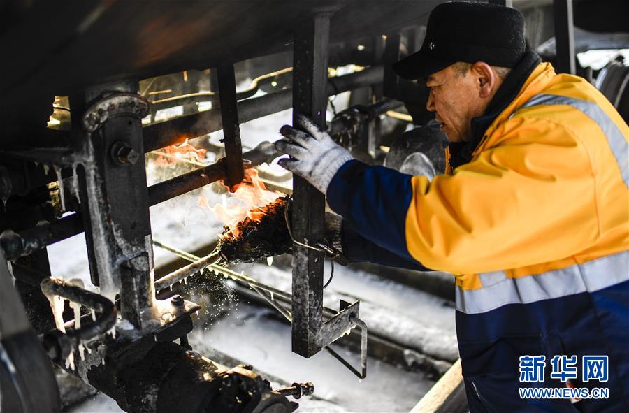 因为冬季温度过低,送水员黄卫东在蓄水前需要提前加热阀门(1月17日摄)。新华社记者许畅摄