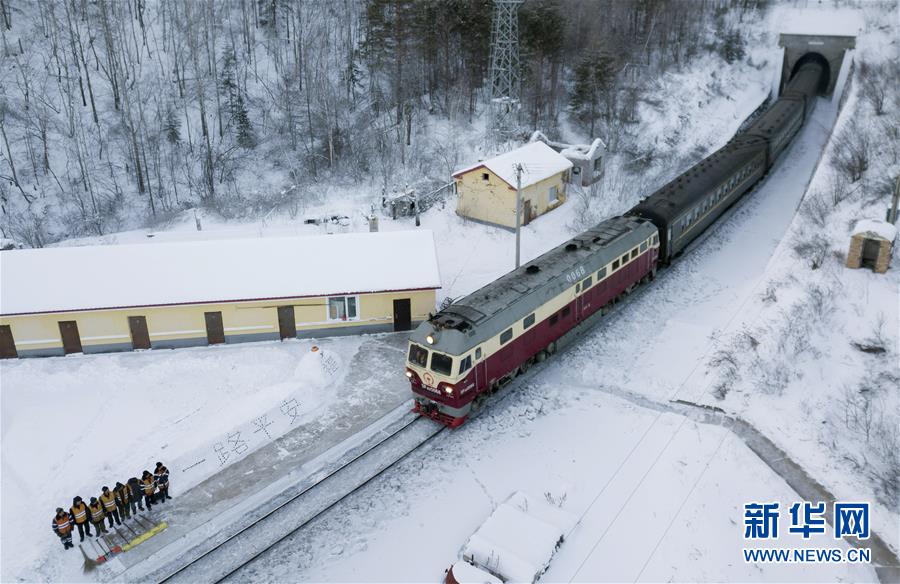 1月7日,西罗奇维修工队工作人员在雪地上写下“一路平安”为经过的列车旅客送上祝福(无人机照片)。新华社记者王毓国摄