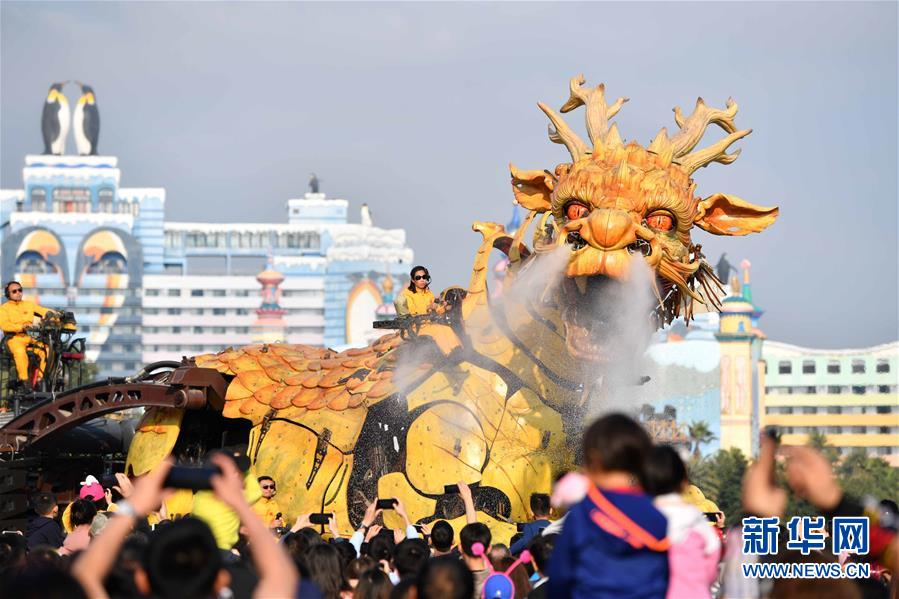 1月18日,大型机械装置艺术品“龙马精神”在珠海长隆海洋王国巡游展示。新华社记者 刘大伟 摄