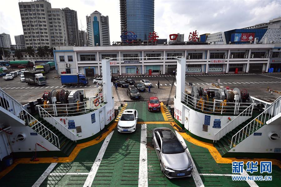 1月19日,车辆在海口秀英港轮渡码头登船。 新华社记者 郭程 摄